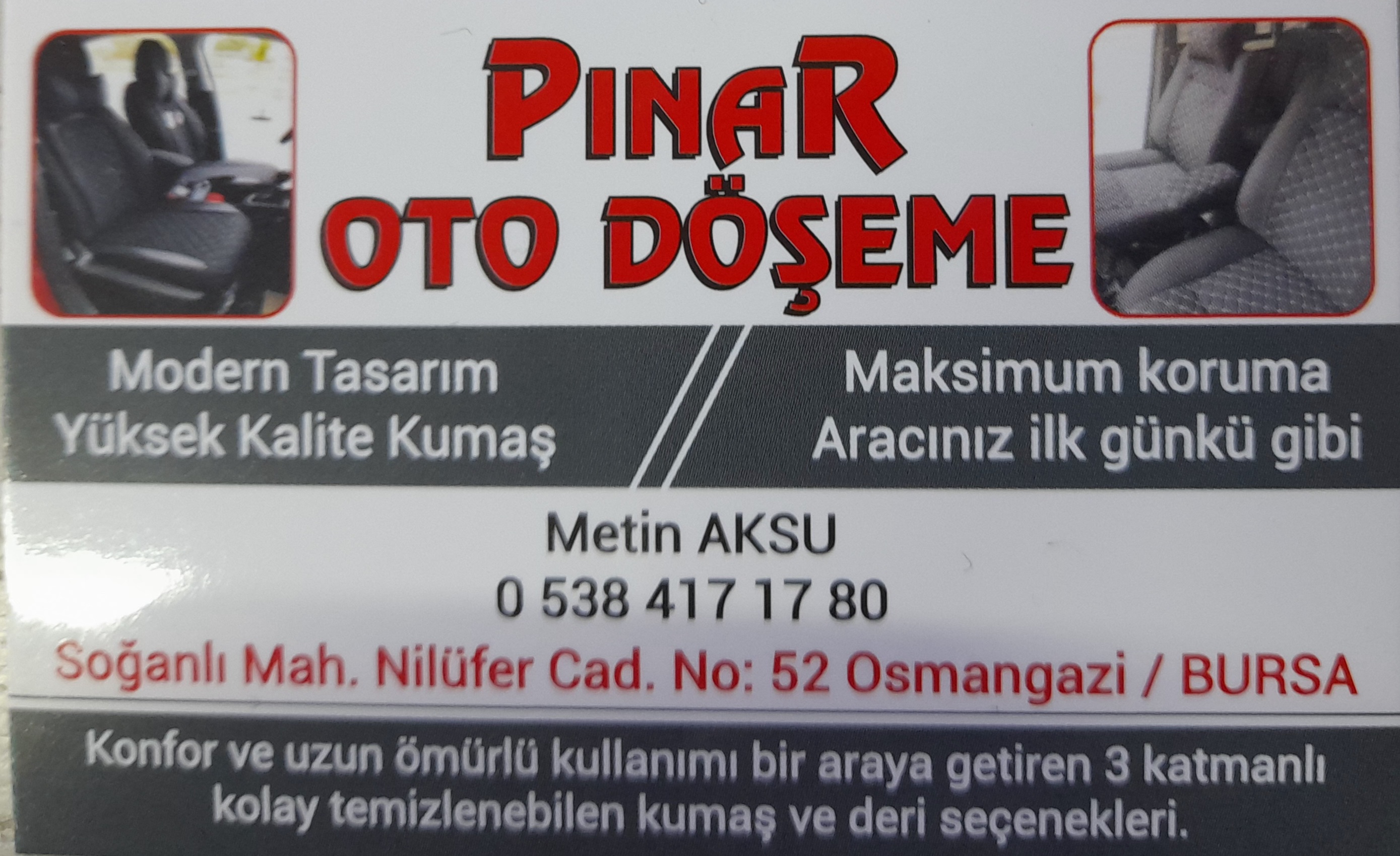 PINAR OTO DÖŞEMEBURSA-OSMANGAZİ-SOĞANLINİLÜFER CAD NO 52METİN USTA05384171780İlan No:729 |