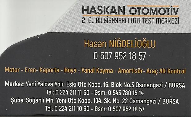 HASKAN OTOMOTİVBURSA-OSMANGAZİ-SOĞANLIYENİ YALOVA YOLU ESKİ OTOKOP 16. BLOK NO:3 OSMANGAZİ BURSAHASAN NİĞDELİOĞLU0507 952 18 57İlan No:517 |